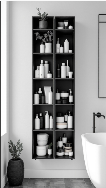 In a black and white bathroom, storage can serve as both a functional solution and a design feature. Here, a tall, streamlined shelving unit keeps essentials neatly organized while adding to the overall aesthetic. The carefully arranged bottles and containers create a tidy, cohesive look that enhances the space.