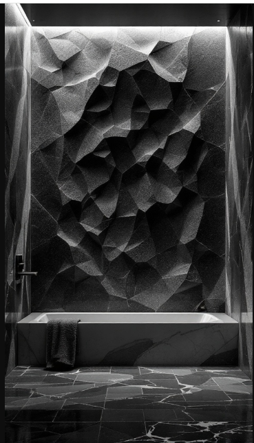 The interplay between matte and glossy surfaces introduces depth, with light and shadow adding dimension that makes the space feel more welcoming. Positioned behind a simple bathtub, the textured wall serves as a dramatic yet elegant backdrop.