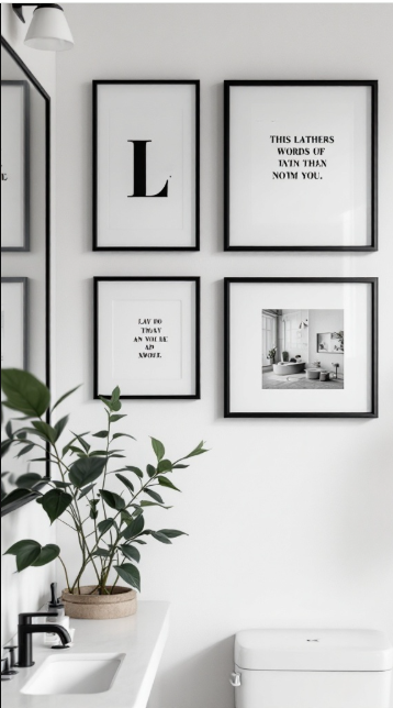 Elegant black-and-white artwork can completely transform a bathroom, turning a simple space into something stylish and refined. In this example, a carefully arranged gallery of frames adds both personality and sophistication. Each piece brings its own character—whether it’s a bold graphic letter, a thoughtful quote, or a striking photograph.