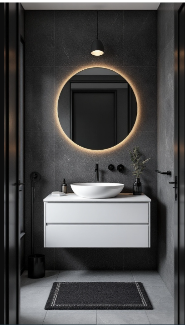 In black and white bathroom décor, lighting is essential for creating balance and atmosphere. In this design, a soft pendant glow contrasts beautifully with the deep, dark walls, highlighting modern features while adding depth that makes the space feel warm and inviting.