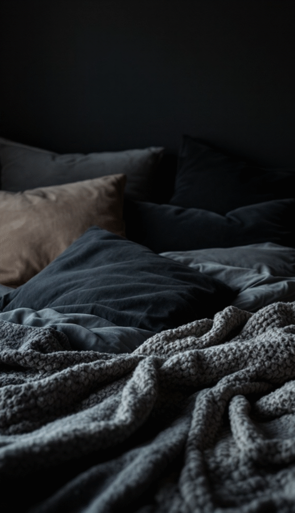 Lastly, arrange your pillows and throws with intention but keep it relaxed. A slightly unstructured layout, like the one shown, gives your bed that effortlessly cozy, lived-in feel. When done right, layering textures is the secret to making your dark bedroom both stylish and irresistibly inviting.