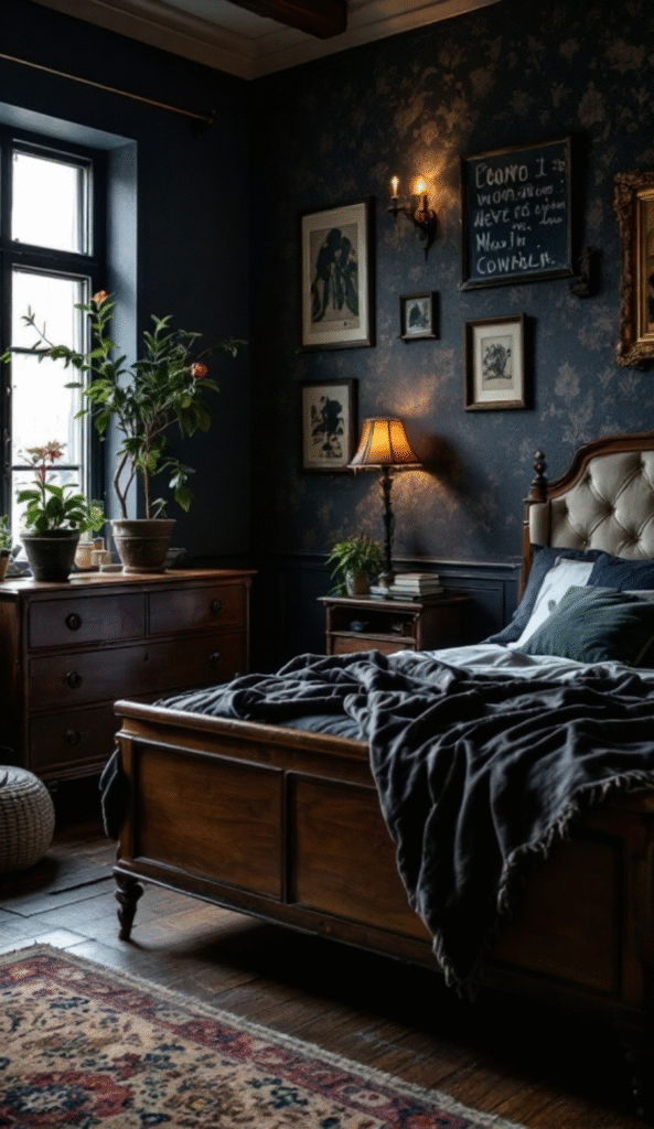 In a dark cozy bedroom, vintage furniture can truly enhance the mood and bring a sense of charm and character. Imagine a beautifully crafted wooden bed with intricate detailing—it becomes an instant focal point and pairs effortlessly with deep, moody wall colors.