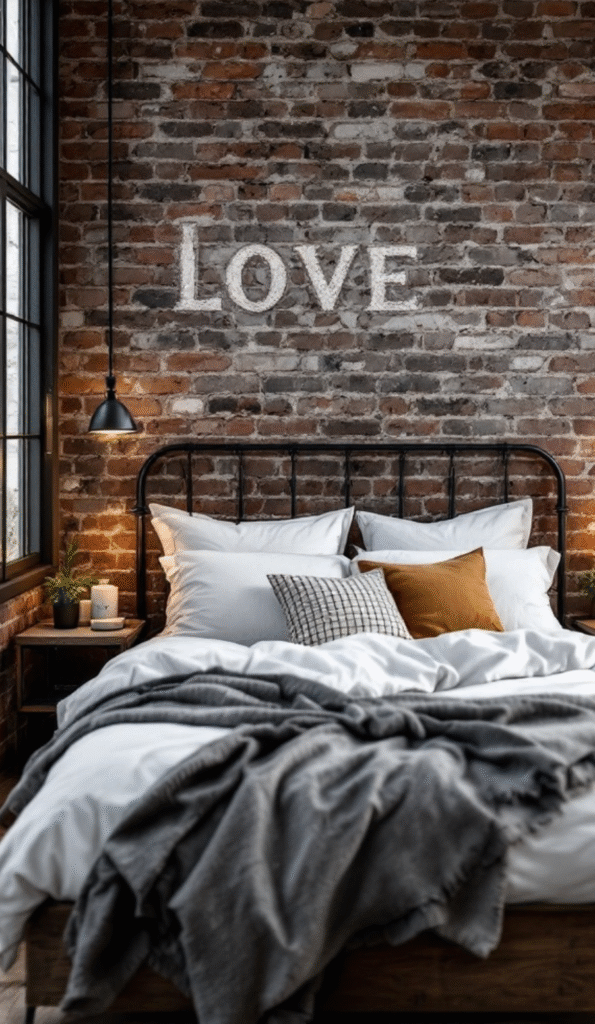 A handwritten “LOVE” on the wall adds a sweet, personal touch, grounding the space with warmth and meaning. This design isn’t just stylish—it’s intentionally crafted to feel like home. By incorporating industrial elements like metal fixtures, rustic wood furniture, and layered textures, you can create a bedroom that feels both modern and deeply inviting.