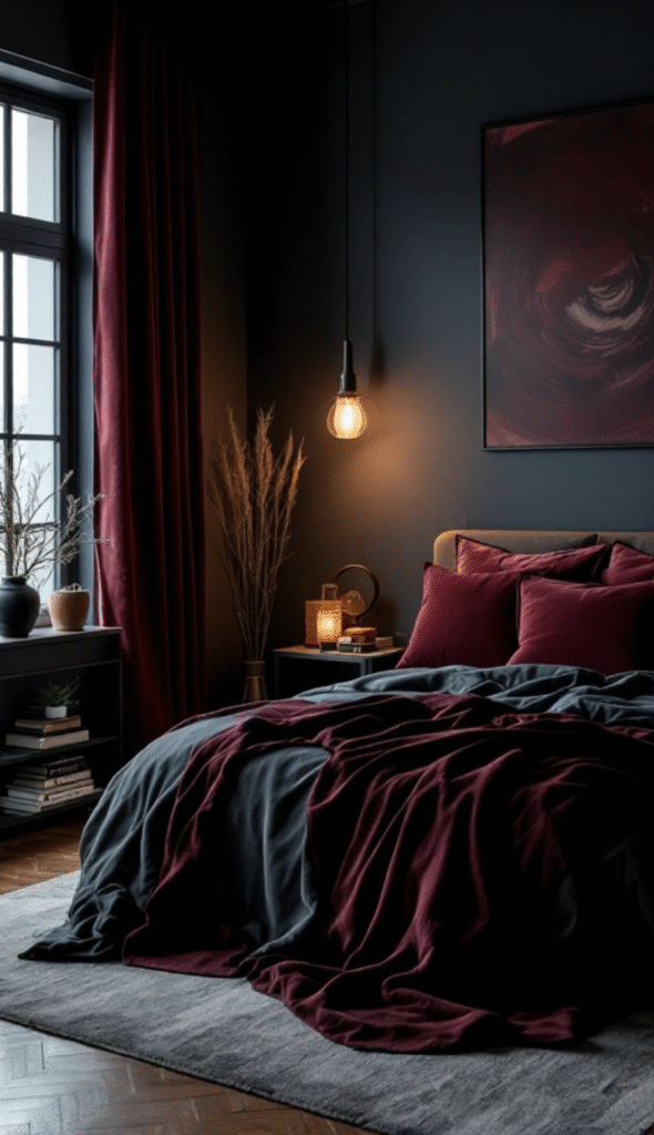 Moody color palettes are key to crafting a cozy dark bedroom, and the image perfectly captures this effect. A rich blend of deep hues sets a relaxing, intimate tone—burgundy bedding pairs beautifully with slate blue accents, creating a space that feels both stylish and serene.