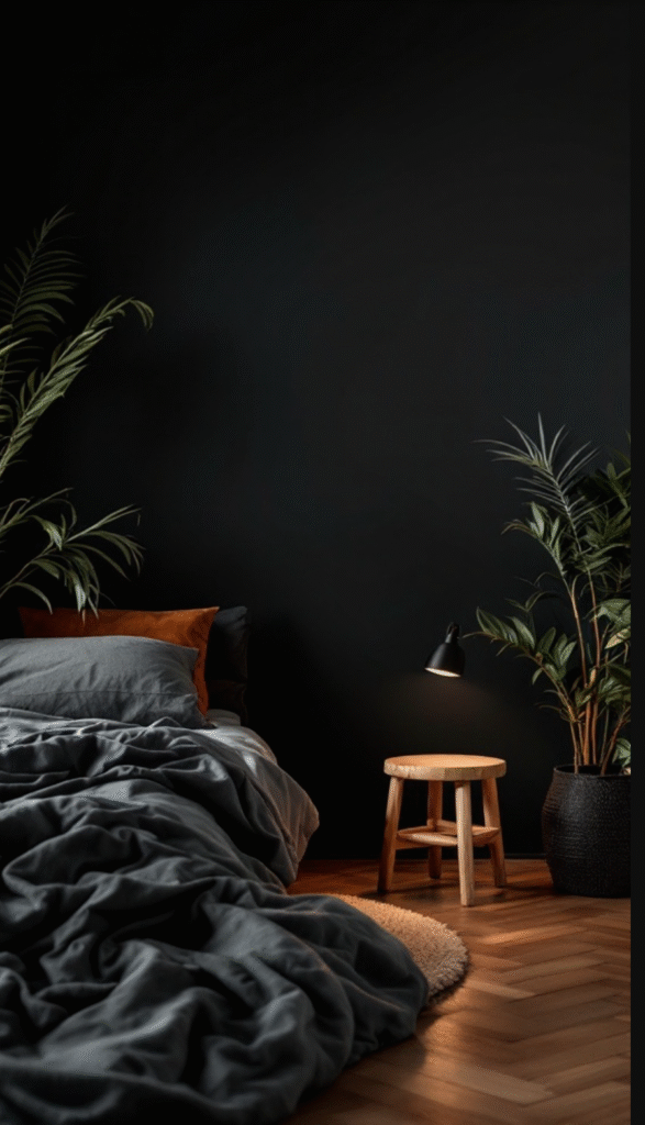 Soft bedding textures paired with natural materials—like the wooden stool and leafy plants—create a harmonious blend that softens the room’s darker palette. These elements not only add visual interest but also promote relaxation and well-being. Plants, in particular, offer a refreshing touch and can help purify the air, enhancing the overall comfort of the room.