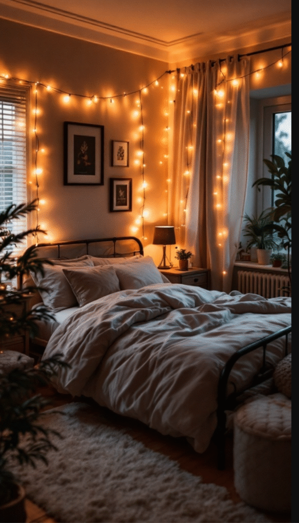 Soft ambient lighting is essential when creating a cozy bedroom, and the image perfectly captures this idea. Warm fairy lights draped along the walls instantly add a gentle glow, infusing the space with a welcoming, relaxed vibe.