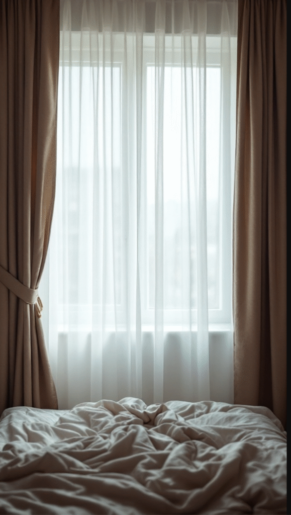 Layered window treatments are a subtle yet powerful way to enhance the cozy atmosphere of a dark bedroom. In the image, sheer curtains paired with heavier drapes create a soft, welcoming look that’s both stylish and functional.