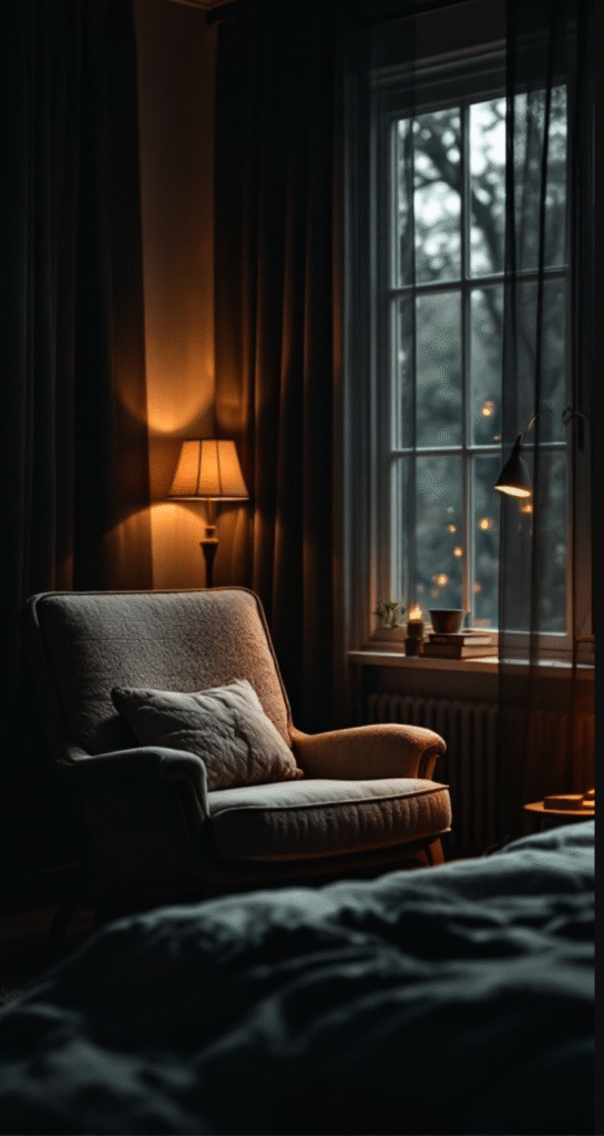 A cozy reading nook can turn a dark bedroom into a peaceful retreat. Picture yourself sinking into a cushy armchair, wrapped in the soft glow of a nearby lamp—an inviting space made for escaping into your favorite book. The warm lighting sets a tranquil mood, perfect for quiet moments of relaxation.