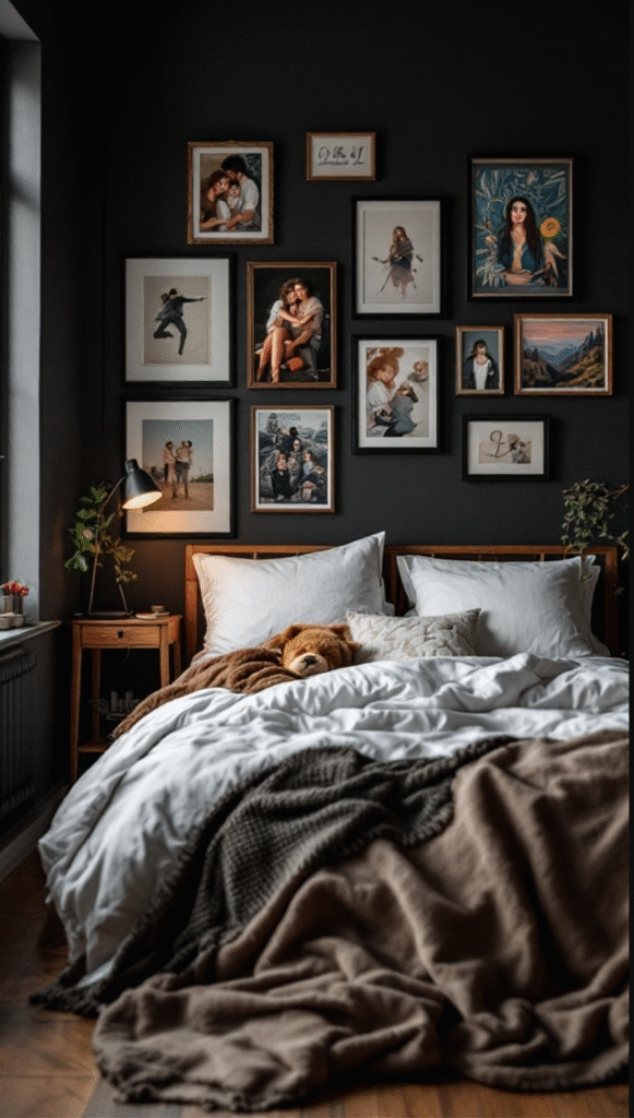 Transforming your bedroom into a cozy retreat is all about the little details, and personalized artwork can play a powerful role. The image showcases a stylish dark bedroom where deep, rich walls create the perfect backdrop for an eclectic gallery of framed pieces.