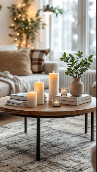 Beside the candles, a small stack of books adds a personal touch. This classic decor choice not only reflects your personality and interests but also invites guests to browse through and engage with your space.
