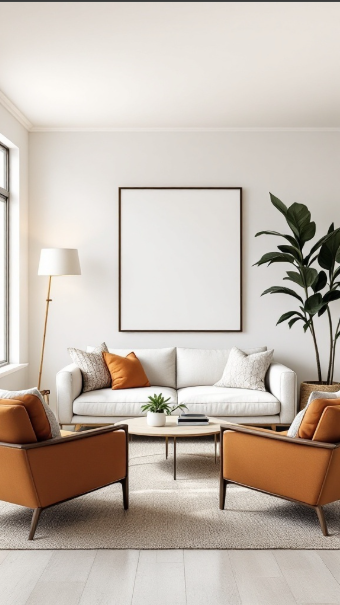 On either side of the sofa, two vibrant orange armchairs add a cheerful splash of color. Their cozy design not only enhances visual interest but also fosters a sense of connection—perfect for conversations and gatherings.