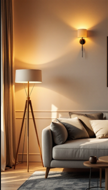 Lighting is a key element in creating a warm and inviting living room, and the image perfectly captures how thoughtful lighting choices can transform a space. The gentle glow from the wall sconce and floor lamp adds depth and warmth, enhancing the room’s overall ambiance.