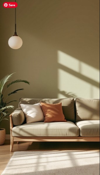 The soft green wall sets a calming backdrop, perfectly complementing the natural tones of the furniture. A muted olive sofa takes center stage, offering a relaxed and welcoming presence. Accented with terracotta and crisp white throw pillows, the space gains subtle pops of color that enhance its warmth without feeling heavy.