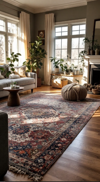 Natural light further enhances the beauty of layered rugs. In the image, the sunlight highlights the rich tones and subtle details of the rug, making it a quiet yet impactful focal point in the room.