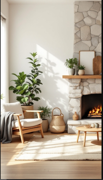 The stone fireplace stands out as a beautiful focal point. Its natural texture and warm tones add depth and character, setting a cozy tone for the entire room. Complementing this are wood and natural fiber accents—like the woven baskets and wooden coffee table—which reinforce the earthy theme and add organic warmth.