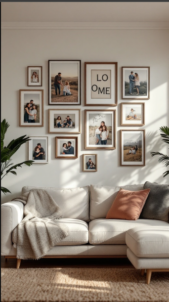 The variety of frame sizes and styles creates visual interest and gives the display a collected, curated feel. At the center, a piece featuring the word “HOME” draws the eye and sets the tone, reinforcing the room’s cozy, welcoming atmosphere. Surrounding it with family photos adds depth and sentiment, making the space feel filled with love and memories.