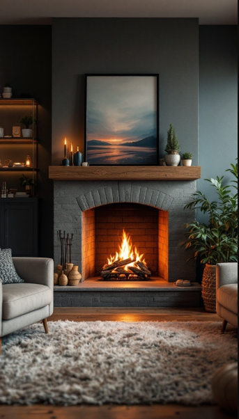In the image, the fireplace is beautifully styled, featuring a sturdy mantel and a glowing fire that radiates a sense of relaxation. Thoughtful decor—like candles, potted plants, and carefully chosen accents—complements the fireplace and contributes to the inviting atmosphere. Neutral wall and furniture tones blend seamlessly with the earthy hues of the fire, creating a space that feels both modern and warm.