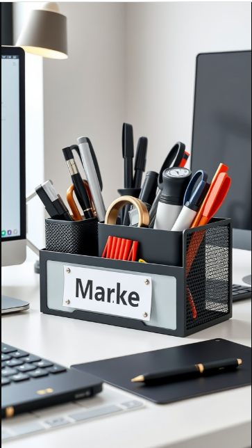 In the example shown, the organizer features a sleek, modern design with plenty of room for pens, markers, and other essentials. A customized name tag adds an extra personal touch, clearly marking the space as your own.