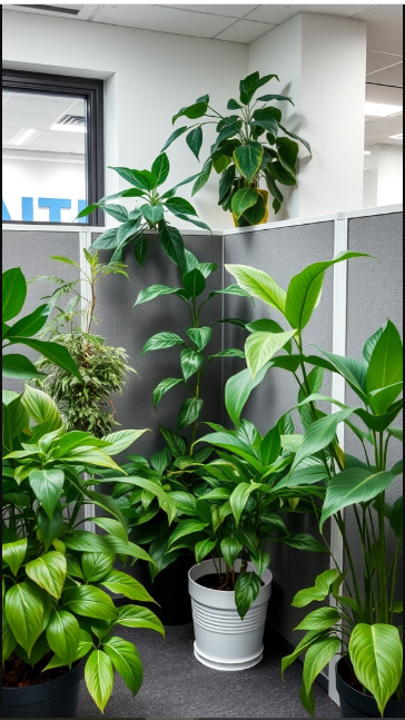 Bringing indoor plants into your cubicle can completely transform the atmosphere. As shown in the image, a touch of greenery not only makes your space more inviting but can also freshen the air. Popular choices like peace lilies and pothos thrive indoors and are especially well-suited for office environments.