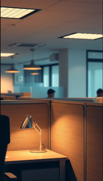 Lighting can completely transform the feel of a workspace. In the image, a cozy desk lamp casts a soft, warm glow, instantly making the cubicle feel more inviting and less clinical. The right lighting doesn’t just set the mood—it can also boost focus, energy, and overall productivity.