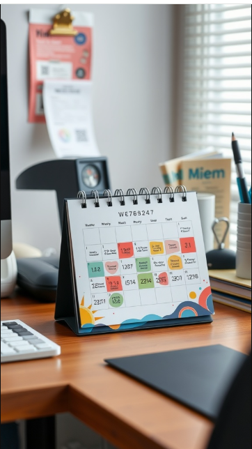 A desk calendar is more than just a way to mark the days—it’s a practical tool that helps keep you organized and focused. In the image, a stylish yet functional calendar brightens the workspace with its colorful design and easy-to-read layout, making it both useful and inviting.
