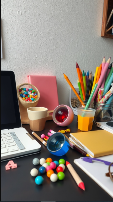 Take the set of colorful pencils, for example. Beyond being practical for jotting down notes or sketching ideas, they double as a cheerful splash of color. Arranged in a clear or decorative holder, they keep your desk organized while brightening the space.