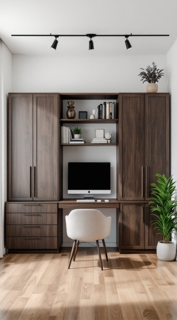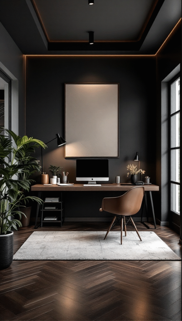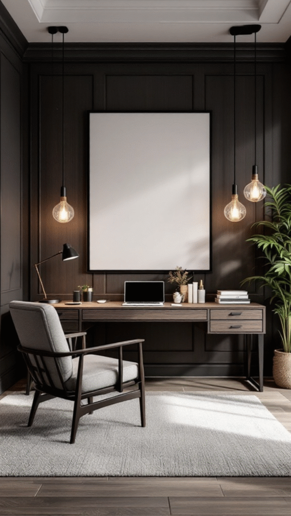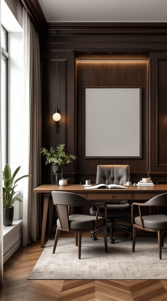 Dark wood paneling adds depth and richness to the room, while a soft rug beneath the desk enhances comfort—ideal for long hours at your workstation. Subtle touches of greenery bring life into the space, softening the minimalist aesthetic without disrupting its clean lines.