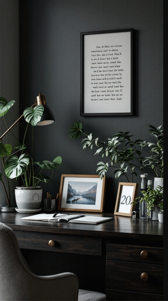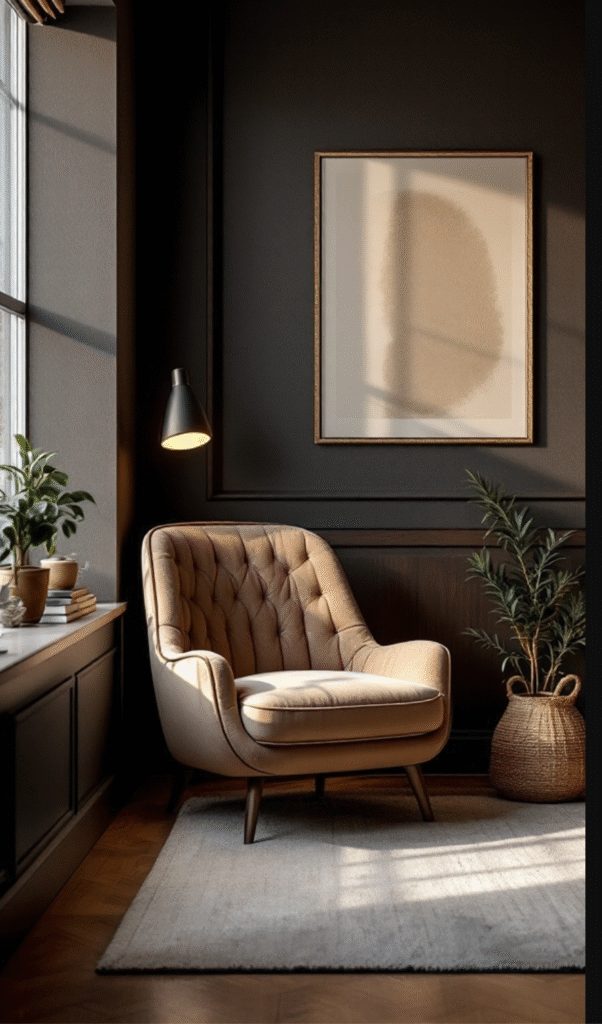 Plants play a key role in softening the room’s deeper tones. Their fresh greenery introduces a natural element, offering contrast and calm that enhances the overall ambiance. This connection to nature helps make the space feel more grounded and serene.