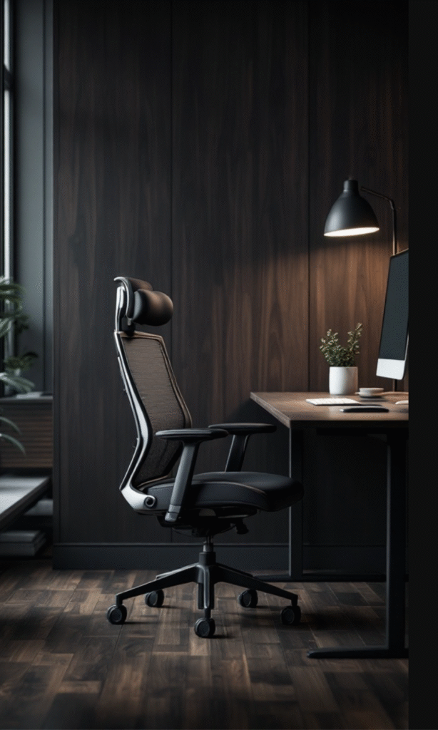 The ergonomic chair in this refined home office is a true standout, seamlessly blending comfort with contemporary style. Its sleek, modern silhouette complements the dark wood paneling, enhancing the room’s sophisticated aesthetic while offering essential functionality.