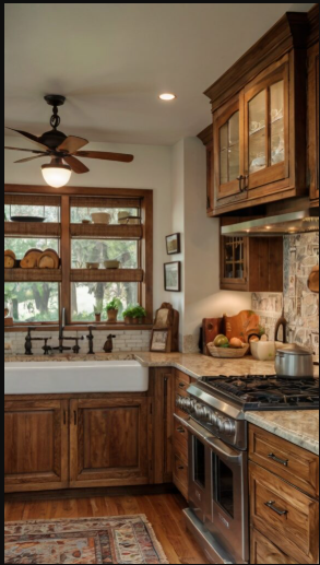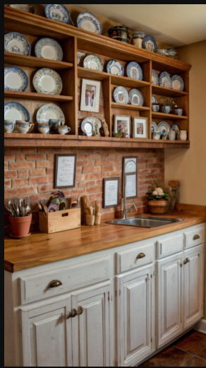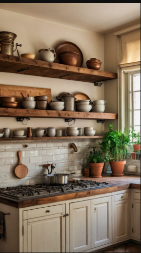 Floating shelves offer the perfect blend of function and style. Use them to showcase your favorite cookbooks, stylish kitchenware, or decorative dish collections. To add warmth and vibrancy, incorporate small potted plants or elegant vases for a refreshing touch of greenery.