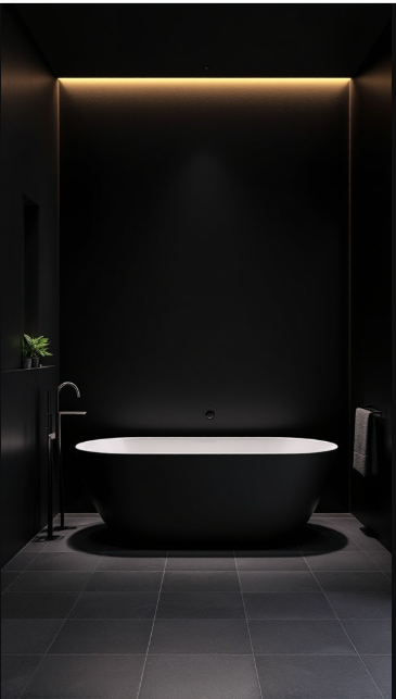 Soft, focused lighting above highlights the tub’s shape, casting a warm glow that enhances the overall atmosphere. The subtle touch of greenery nearby adds freshness, softening the dramatic palette and making the room feel more inviting.