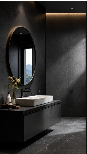 Textured black walls bring a striking, dramatic presence to this bathroom, adding both depth and sophistication. Their rich surface detail draws the eye, making the space feel dynamic and visually engaging.
