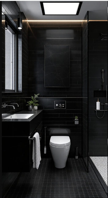 This modern black bathroom highlights the striking elegance of contrast. Deep black tiles wrap the space in a dramatic, intimate atmosphere, while crisp white accents interrupt the darkness to create balance and visual harmony.