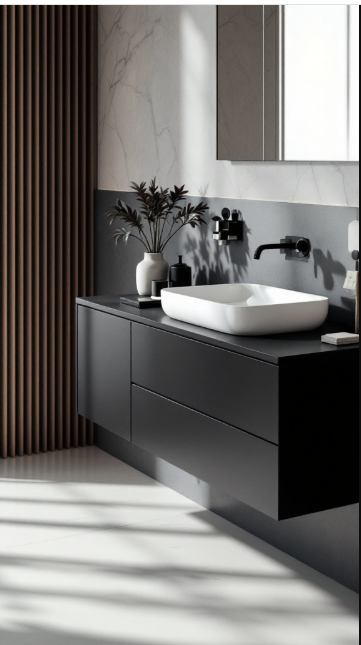 In modern black bathrooms, a minimalist black vanity often sets the tone. With its sleek lines and understated design, it creates a calm, refined atmosphere that transforms the bathroom into a relaxing retreat.