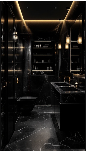 To balance the boldness of black, natural accents such as greenery or wooden details can be introduced. These touches soften the space, creating a calm, inviting atmosphere that feels both modern and restorative.