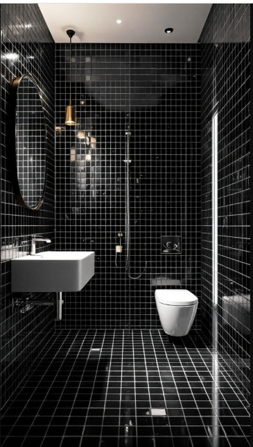 Black tile designs bring striking elegance to modern bathrooms, instantly making a bold statement. In this space, glossy black tiles flow seamlessly across both the walls and floors, creating a cohesive look that feels calm yet undeniably sophisticated.