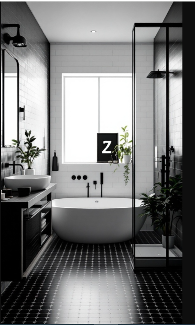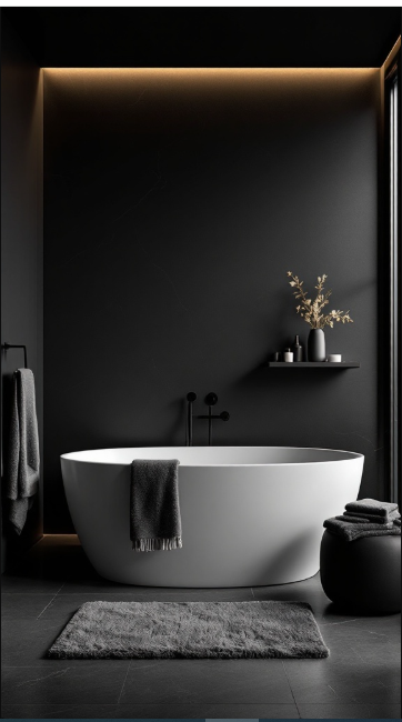 In modern bathroom design, a freestanding bathtub often becomes the star of the space. In this black bathroom, the tub’s crisp silhouette stands out beautifully against the dark walls, creating a bold yet elegant contrast. Its smooth curves and refined lines instantly evoke a sense of comfort and luxury.