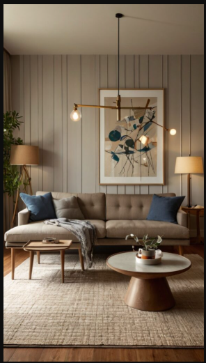 Decor: Blend modern and mid-century accents, like a simple geometric rug, abstract artwork, and sculptural decor pieces, for a polished yet inviting atmosphere.