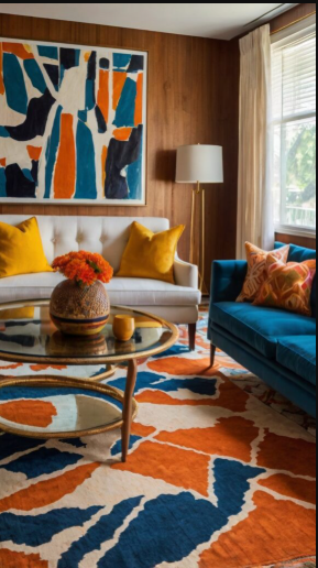 Furniture: Choose a deep blue sofa as the focal point, paired with orange and yellow accent chairs to create a lively contrast.