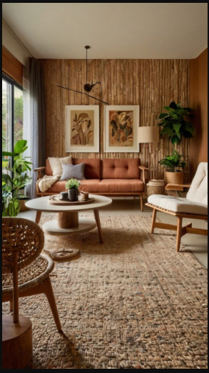 Furniture: Choose a wood-framed sofa upholstered in natural fabric, complemented by a stone coffee table and woven armchairs for added texture.