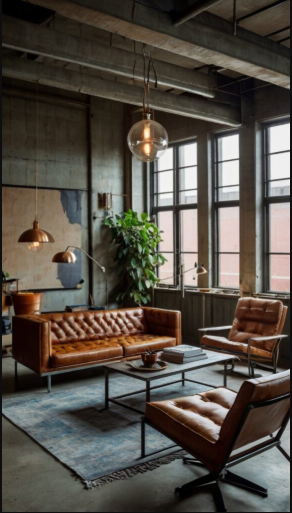 Furniture: Opt for a leather sofa as the centerpiece, paired with a metal-framed coffee table and industrial-inspired armchairs for a bold, urban feel.