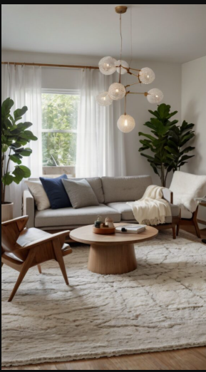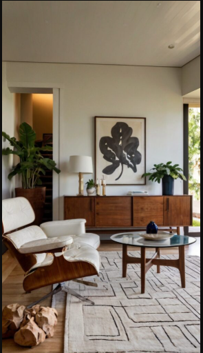 Furniture: Opt for a low-profile sofa with clean, streamlined lines, complemented by a wooden coffee table and mid-century armchairs for a cohesive look.