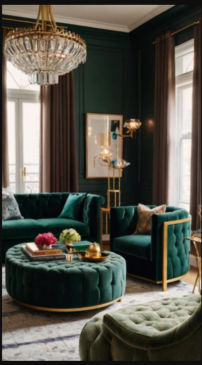 Furniture: Choose a velvet sofa in a deep, rich hue, complemented by a marble coffee table and sleek leather armchairs for a sophisticated aesthetic.