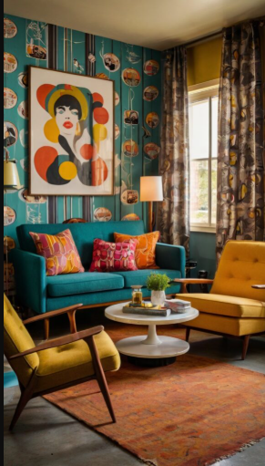 Furniture: Opt for a vibrant, colorful sofa paired with vintage-style armchairs and a retro coffee table to anchor the space.