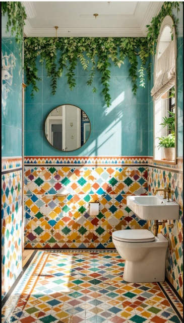 Moroccan-inspired tiles are a fantastic way to infuse your bathroom with color and energy. In this design, a vibrant mix of greens, yellows, and reds creates a lively, inviting atmosphere that instantly brightens the space.