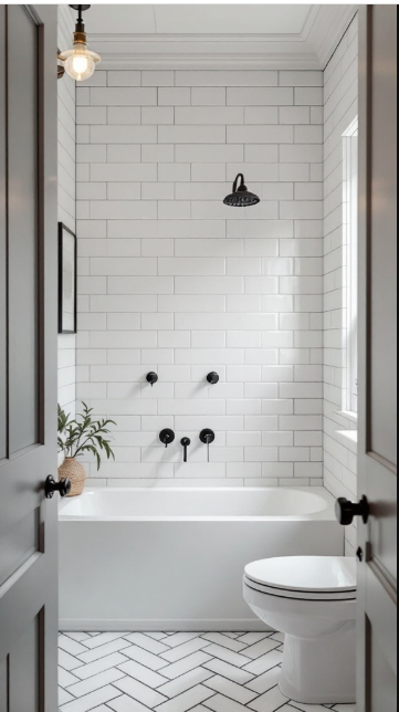 Laid in a traditional horizontal pattern, the tiles bring timeless elegance that pairs effortlessly with styles ranging from modern to vintage. The contrast of sleek black fixtures against the white backdrop adds a contemporary edge while still keeping the room cozy and welcoming. A simple potted plant softens the clean lines, introducing a refreshing touch of nature.