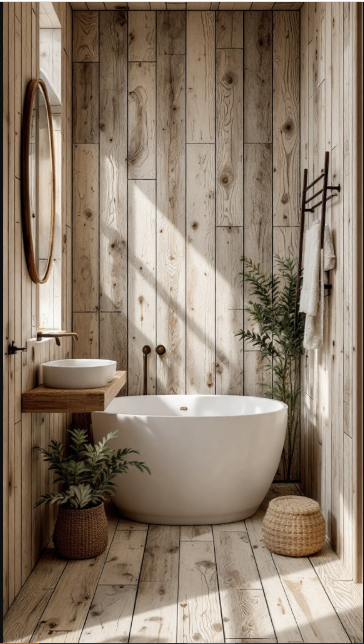 Greenery adds the finishing touch, bringing freshness and life to the space while complementing the earthy wood tones. Whether you’re going for a full rustic retreat or just a subtle hint of natural charm, wood-look tiles are a practical and stylish choice. They’re durable, moisture-resistant, and easy to maintain—making them as functional as they are beautiful.
