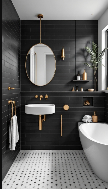 Matte black tiles bring a bold, sophisticated edge to bathroom design. Their sleek finish adds depth and richness, instantly transforming the space into something modern and refined. In this example, the matte black walls create a dramatic backdrop that contrasts beautifully with the lighter elements in the room.