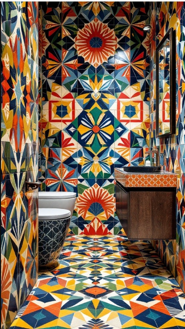 Bold geometric tiles are a striking way to elevate bathroom walls and add personality. In this design, vibrant patterns in reds, blues, greens, and yellows work together to create a lively, energetic atmosphere that immediately draws the eye.