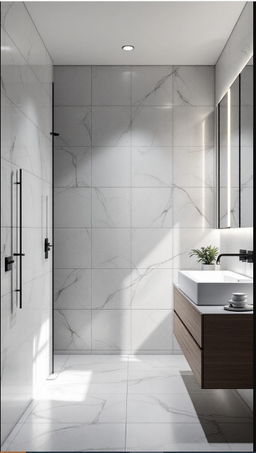The use of large-format tiles enhances the sense of space, making the room appear larger while reflecting natural light beautifully. The restrained color palette emphasizes brightness and simplicity, giving the bathroom a refreshing, tranquil vibe.